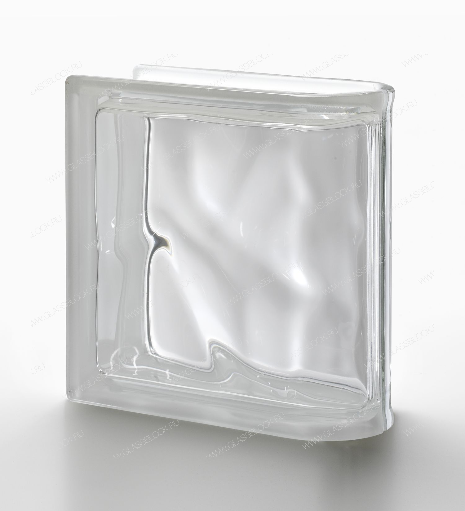 Торцевой прозрачный стеклоблок в фактуре "Волна". Итальянские блоки отличаются большей прозрачностью без зеленого отлива.